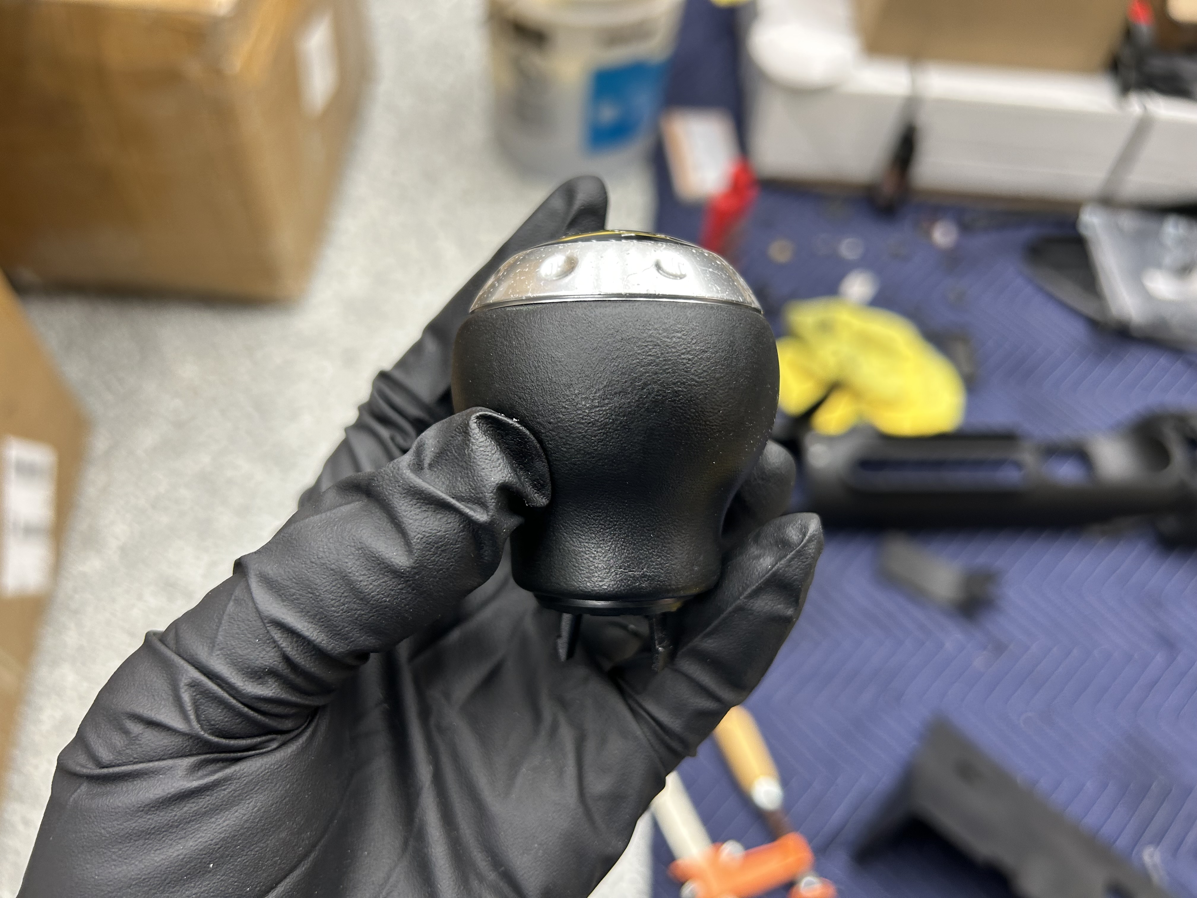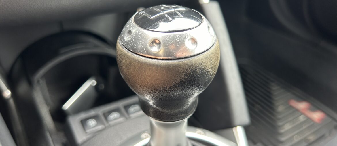Here’s the leather shift knob on my Audi TT. The top portion is made out of stainless steel and plastic, but the lower half is wrapped in black leather. As you can tell, the leather is intact, but the black color has worn down quite a bit. This is the perfect candidate for re-dyeing the leather, which can easily restore the look of the shift knob.