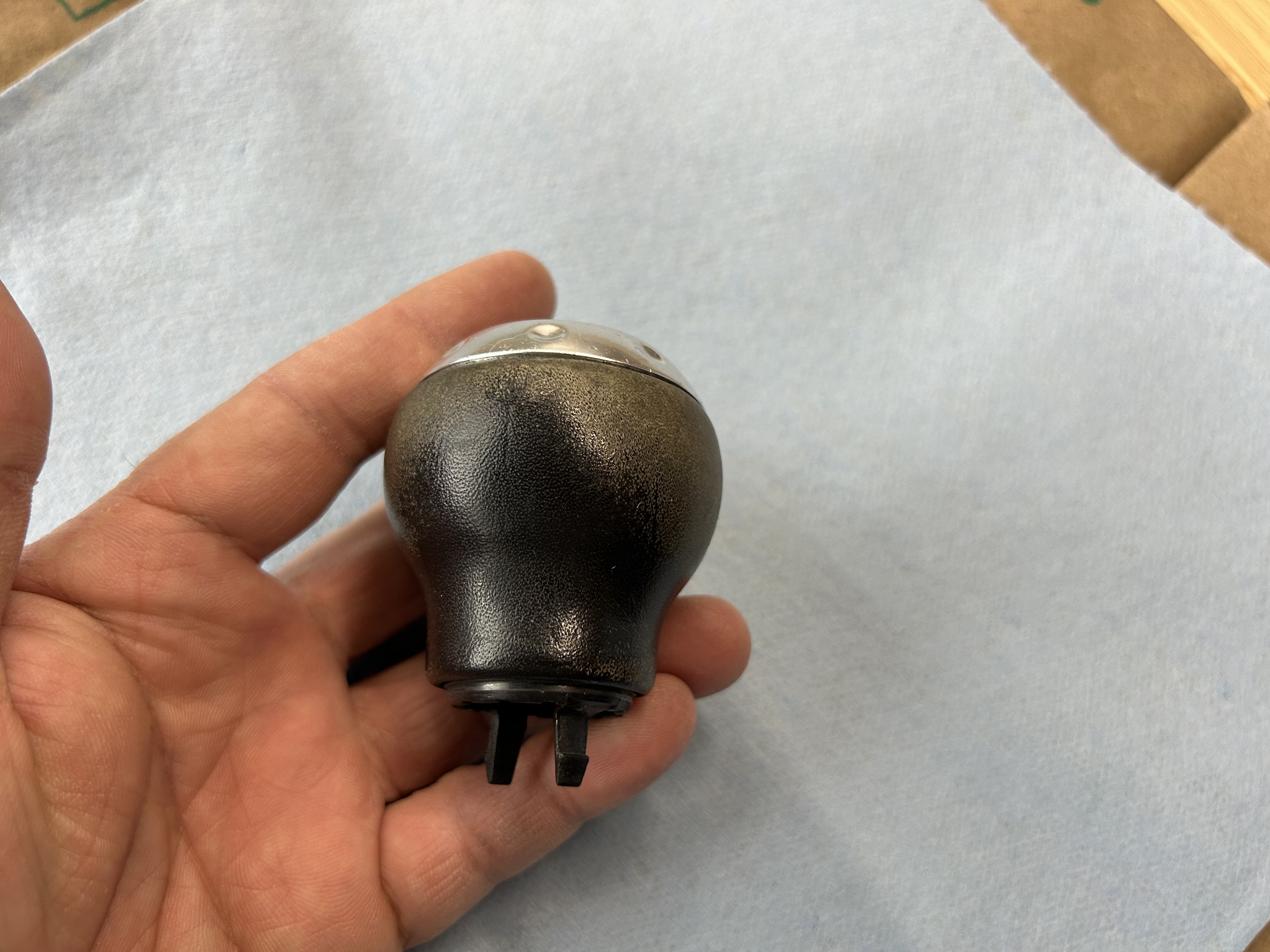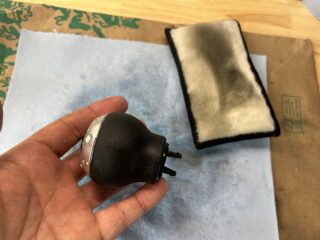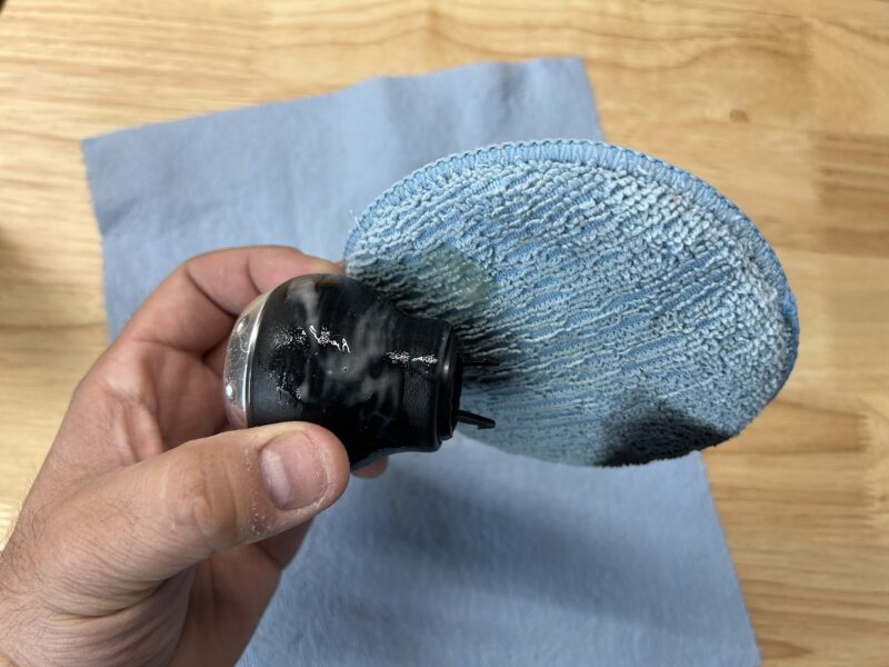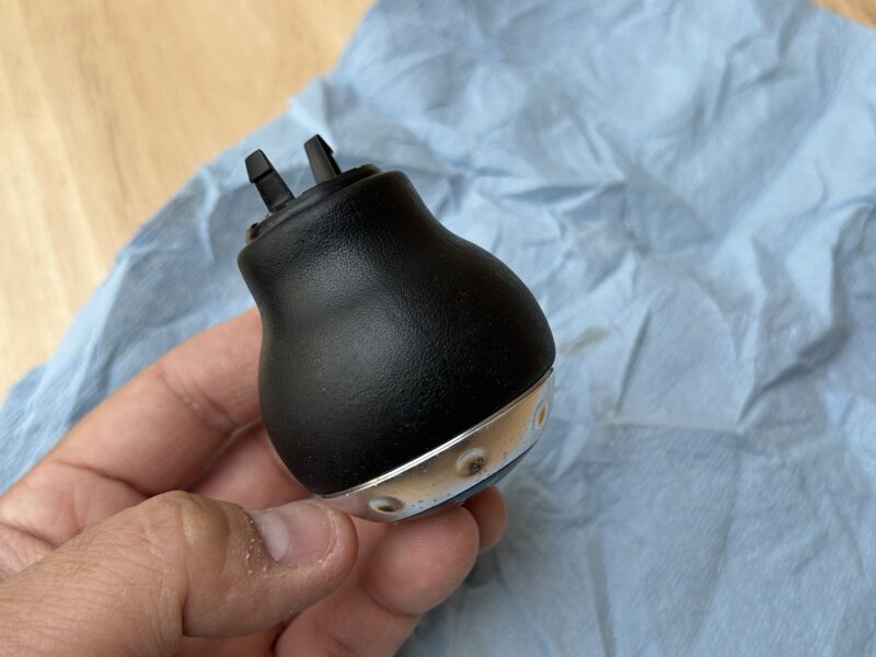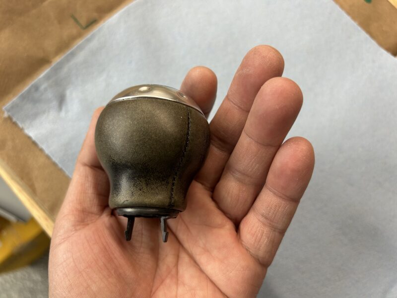 After I scrubbed the leather on my shift knob and cleaned it off, it looks like this. It’s darkened because it is wet, but once it dries again, it will apppear worn again. Let it completely dry before you go to the next step to re-dye the leather.