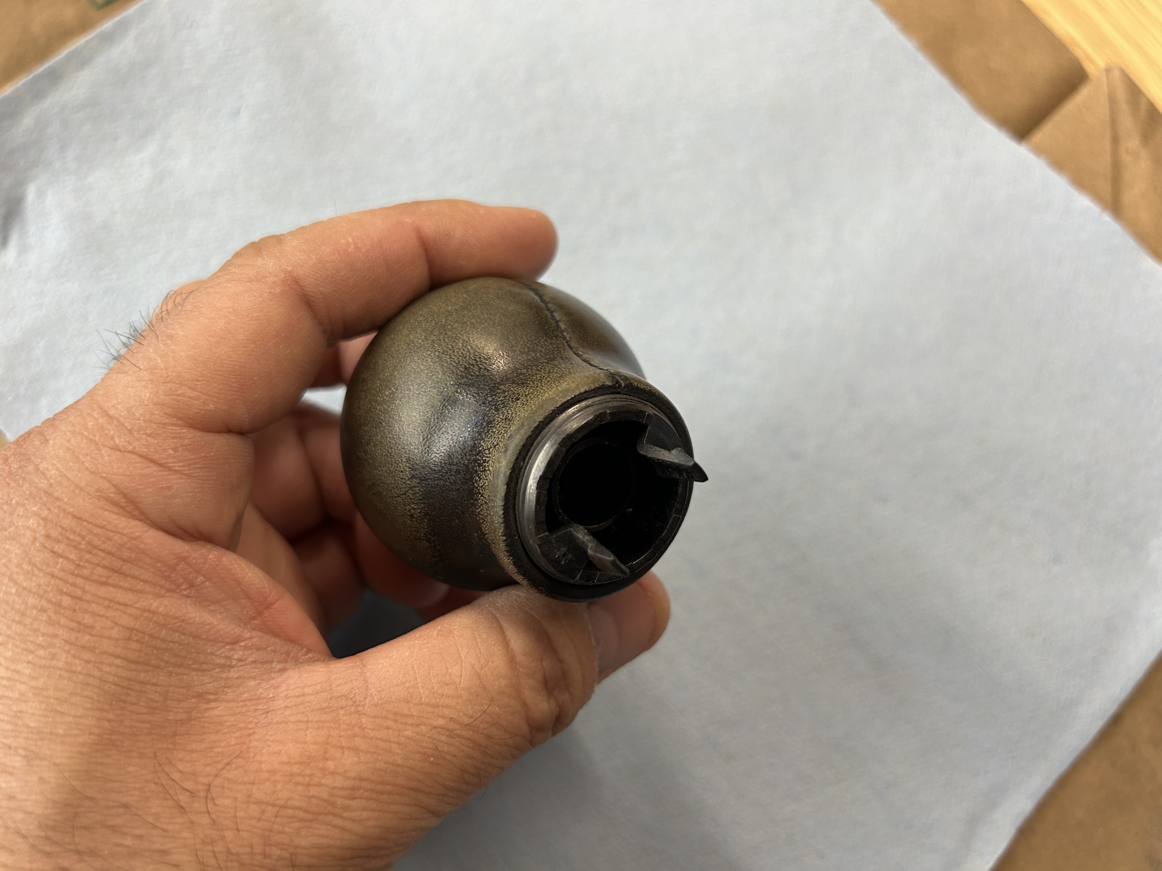 When re-dyeing the shift knob, it’s best to remove the shift knob completely from your car. It’s entirely possibly to do all of this without removing the shift knob from your car, but removing it makes it easier to do. Take a good look at all of the leather on your shift knob and confirm that it is only the leather dye that has worn down. If the leather is broken or the material itself has worn down, you may need to replace the leather part of it.