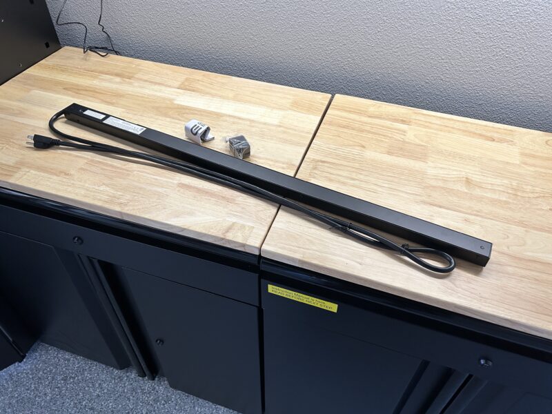Here’s where a long outlet strip comes in handy. It’s really nice when you can mount it to the wall where it is not on your workbench or table, but easily accessible right there in the work area. I picked up a couple of these 6 ft. outlet strips. There are all kinds of options out there, but I chose this one because it was all black. Some outlet strips have visibly colored outlets, which I did not want to see in my workshop– it stands out too much.