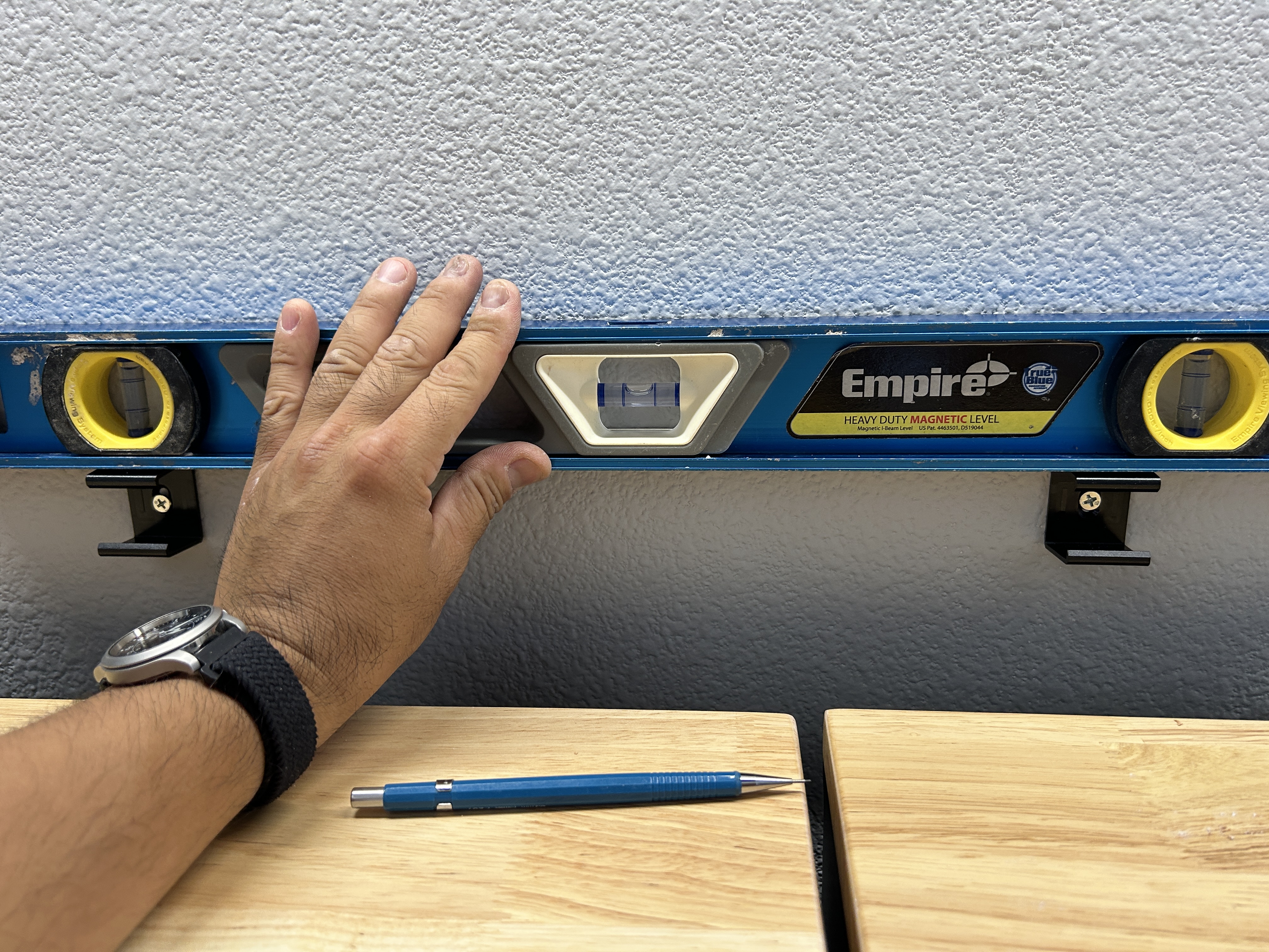 Measure out the area that you want to install the power strip to. Find the studs, and pre-drill holes for your mounting screws. Also make sure that the brackets are level prior to securing them to the wall. The pre-drilled hole diameter should match the diameter of the screw shaft, not the threads. Use either construction screws or even decking screws; do not use drywall screws.