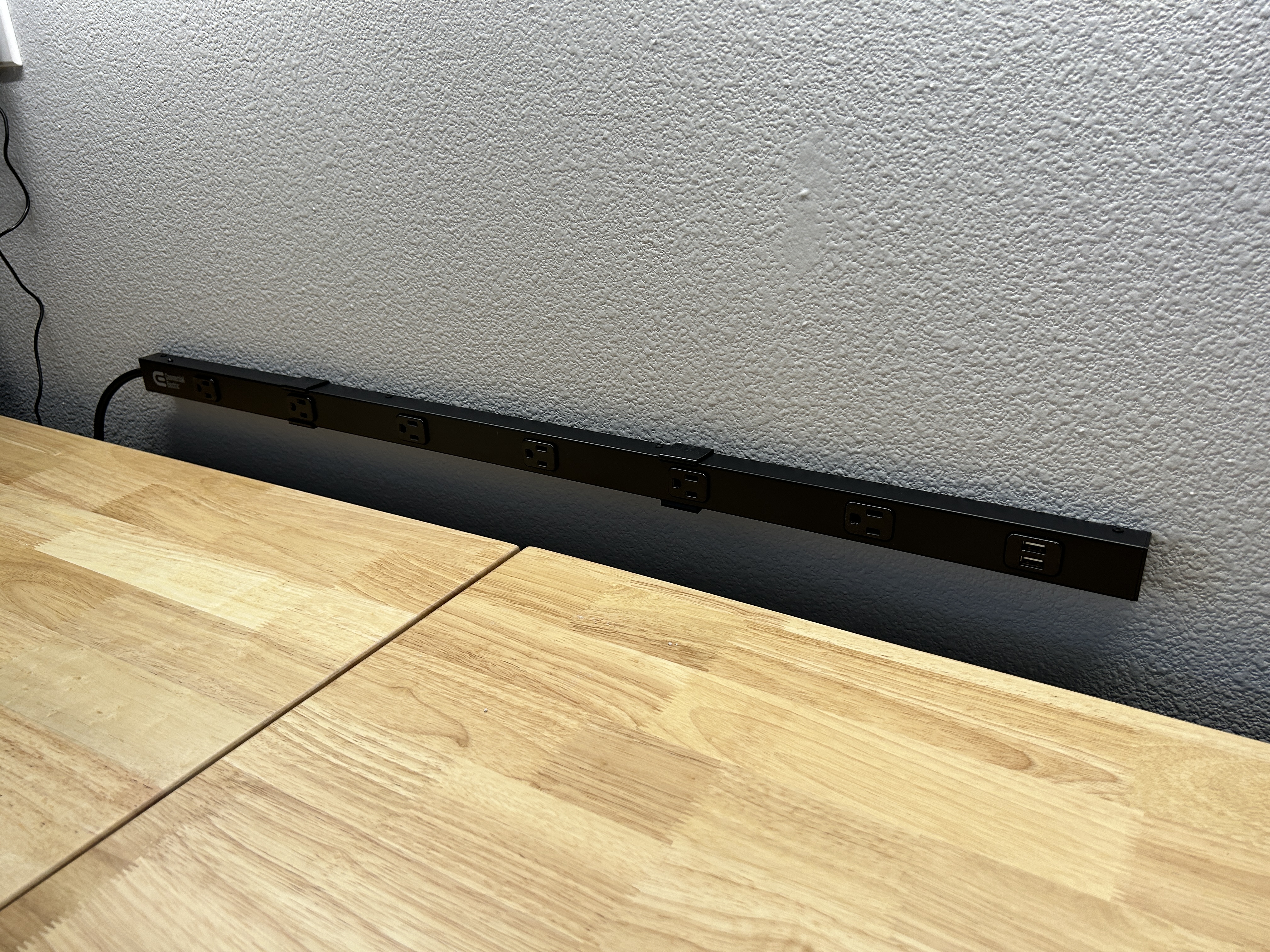 Then, you just press the power strip into the mounting clips you just mounted and you’re done! Plug in the outlet strip and you now have easy access to multiple plugs at your workstation.