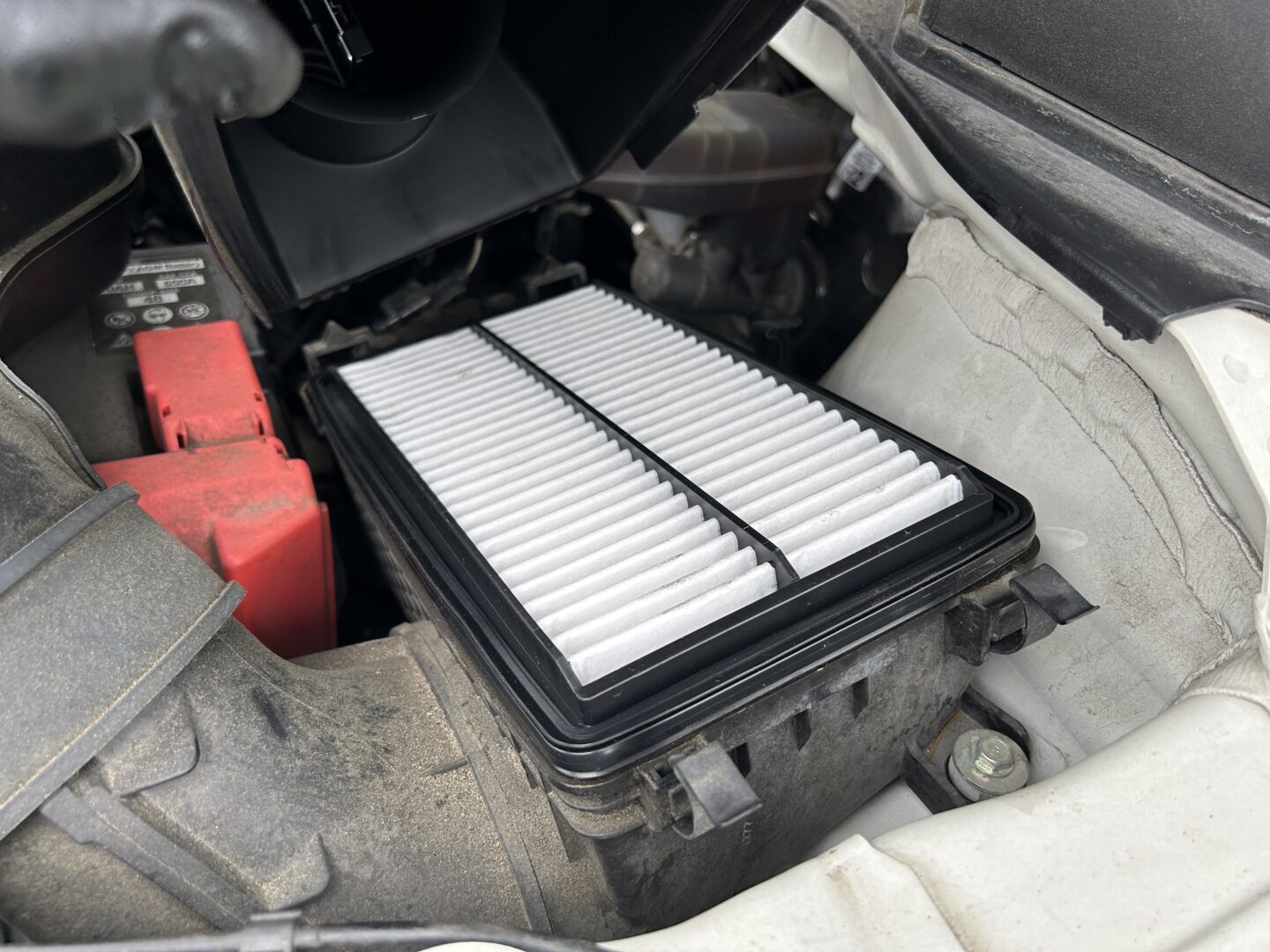 You’ll then be able to lift up on the air cleaner element and remove it. The new filter replacement goes right in the same exact way. I went with an affordable aftermarket replacement. As you can see below, my old air filter was in need of replacement; it has been in the car since new.