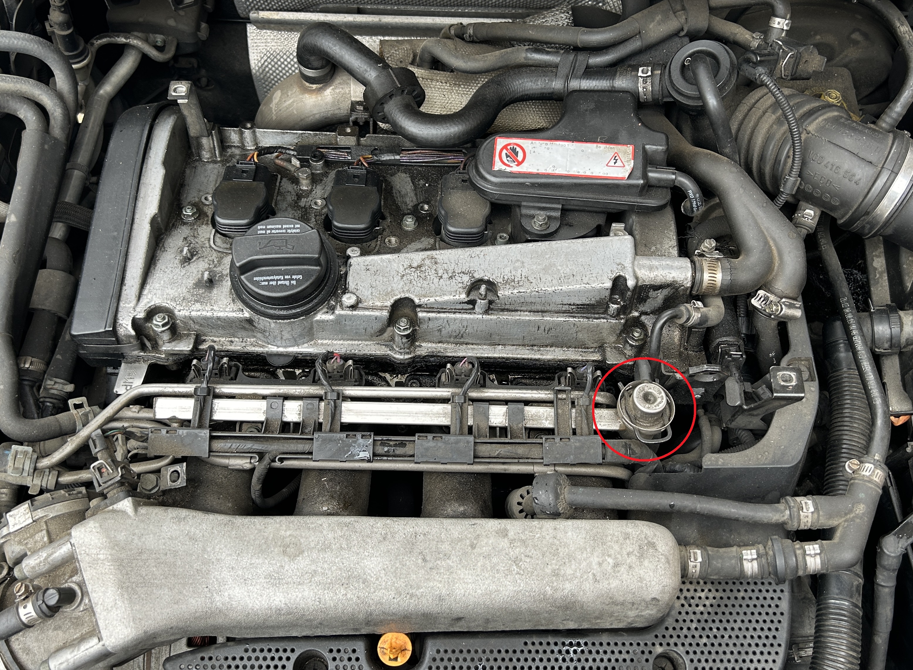 One of the problems with working on an older car is that every time you touch something, something else always seems to break. My 2002 Audi TT is no exception. While doing the many maintenance items on my car, I accidentally bumped into the fuel pressure regulator (circled below in red). As a result, it started leaking fuel while the car was running.